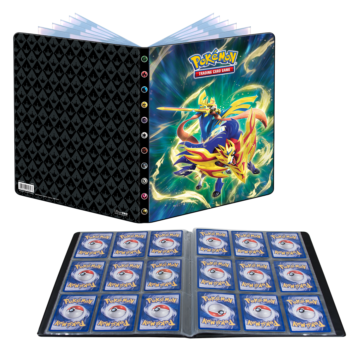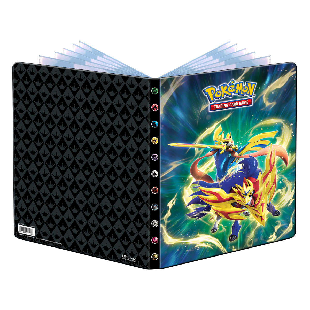 - Officially licensed Pokémon Trading Card Game 9-Pocket Portfolio featuring Crowned Sword Zacian and Crowned Shield Zamazenta