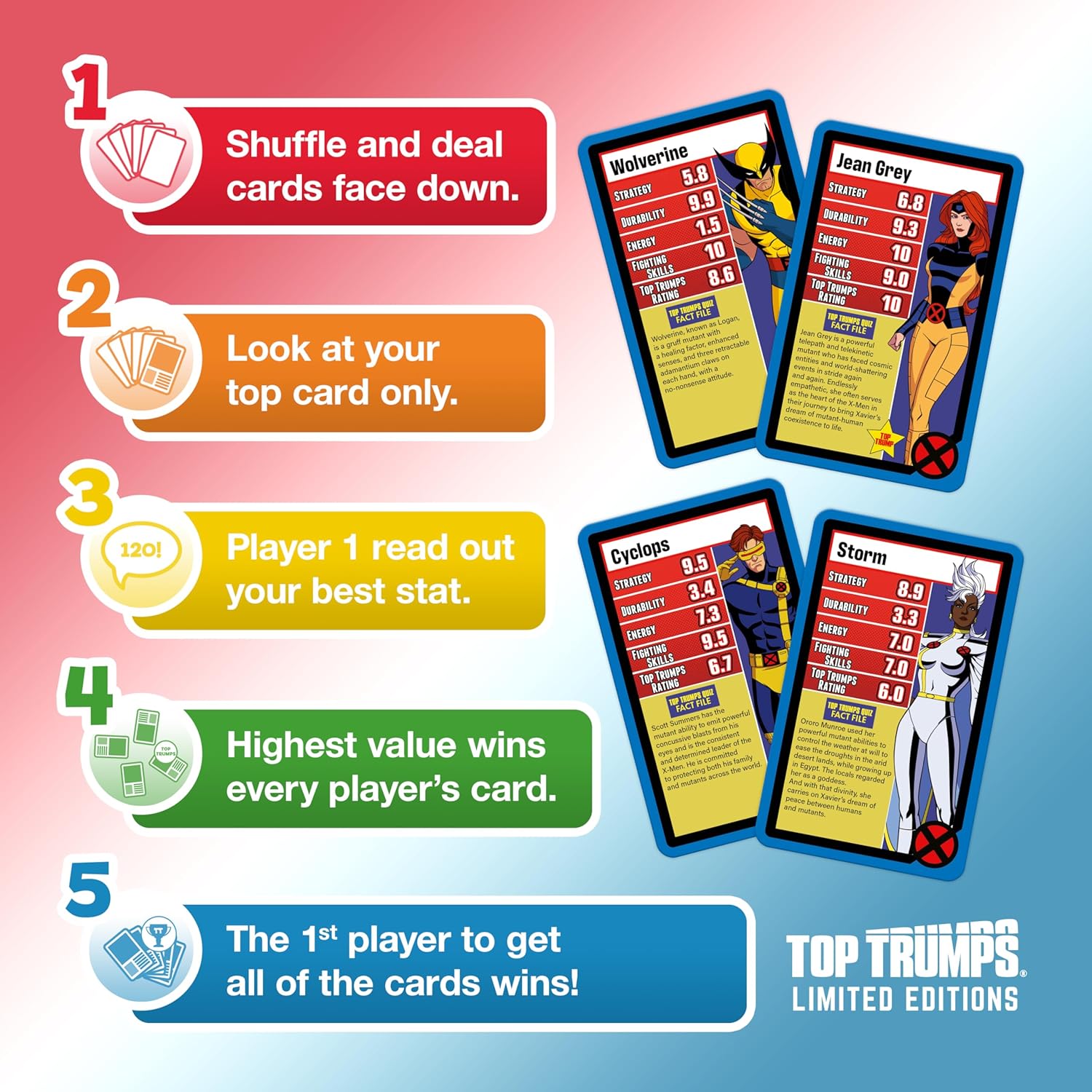 Step through the doors of Xavier's School for Gifted Youngsters and harness your uncanny abilities with this X-traordinary X-Men '97 Top Trumps Limited Editions. Featuring 30 characters from the hit animated series, this edition is sure to astonish!
